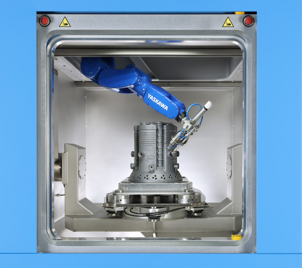 • Roboterintegration in das Entpulverungssystem: Der Roboter kann verschiedene Aufgaben ausführen wie zum Beispiel Pulverreste abblasen, Sauberkeitskontrolle, gezieltes Abklopfen von Pulveranhaftungen etc.